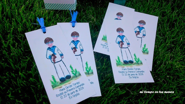 Como veis al principio los marcapáginas no llevaban ningún detalle, pero luego le añadí la cinta azul para que quedasen más alegres.